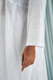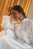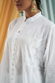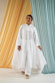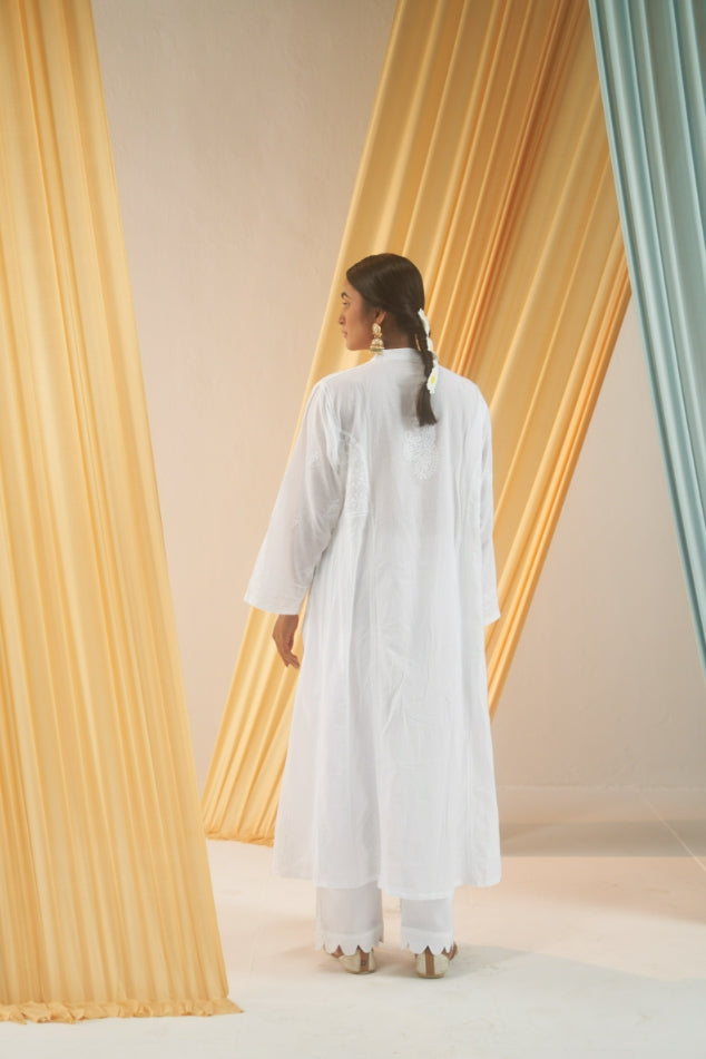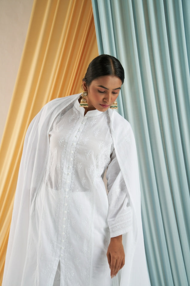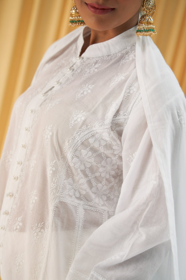 White mulmul front open suit set with intricate chikankari embroidery paired with pant